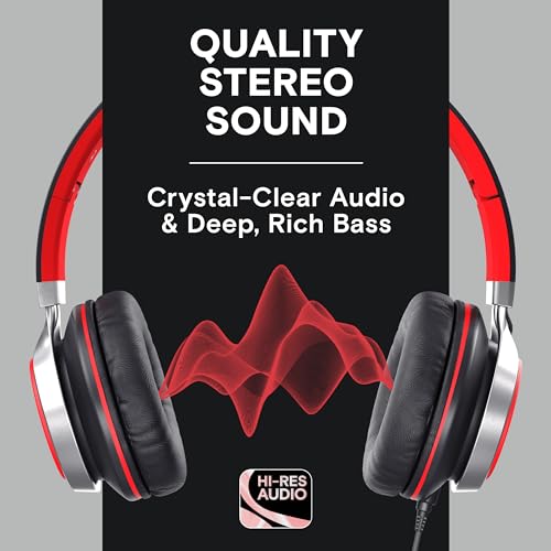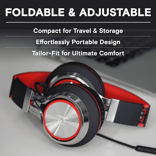 Artix CL750 Opvouwbare, Geluidsisolerende On-Ear Koptelefoon met Draad en Microfoon en Volumeregeling, Stereo Koptelefoon met Snoer en Verstelbare Hoofdband voor Computer, Laptop en Mobiele Telefoon (Zwart/Rood)