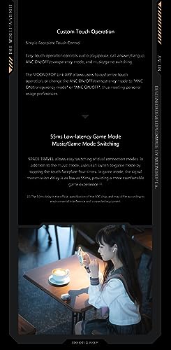 55 ms. Spelmodus met lage latentie. Schakelen van muziek-/spelmodus: Space Travel maakt het eenvoudig schakelen van dubbele verbindingsmodi mogelijk. Naast de muziekmodus kunnen gebruikers overschakelen naar de spelmodus door vier keer op de aanraakplaat te tikken. In de spelmodus is de vertraging van de signaaloverdracht zo laag als 55 ms, wat een comfortabelere game-ervaring biedt 2. De vertraging van 55 ms is de officiële specificatie van de SOC-chip en kan verschillen afhankelijk van omgevingsinterferentie en aangesloten apparatuur.